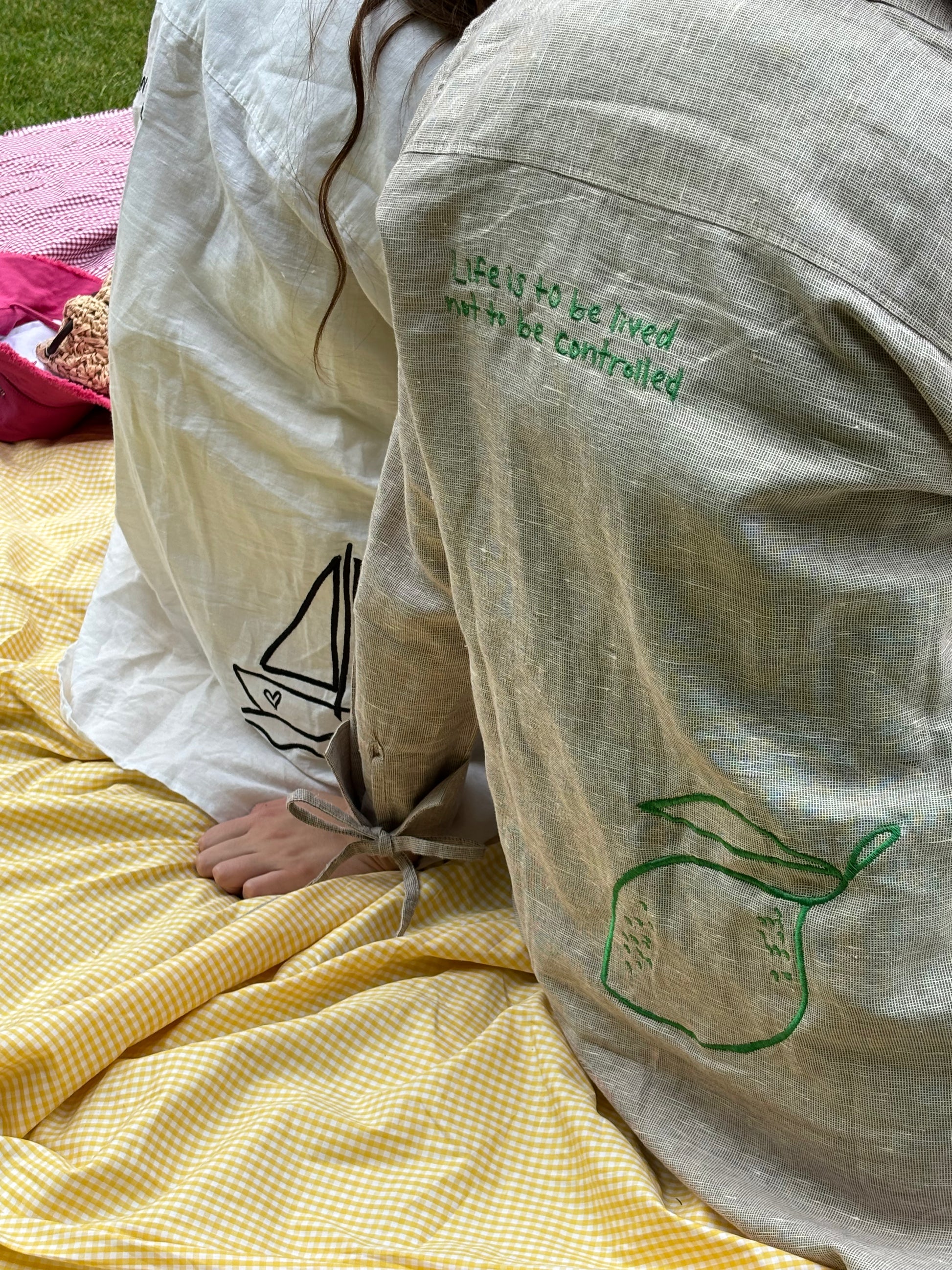 Beige Shirt: Embrace spontaneity with the quote "Life is to be lived, not to be controlled." The playful green stitching adds a vibrant touch, encouraging you to cherish the beauty in the unexpected.